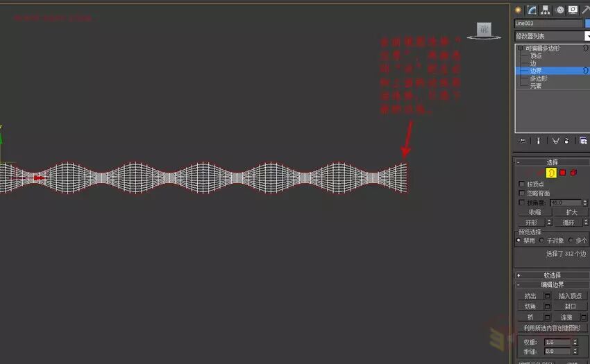 20.在前视图选择“边界”,再转选到“边”把左右和上面的边线取消选择,只选下面的边线。