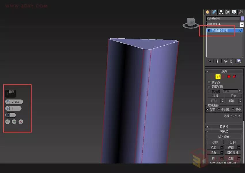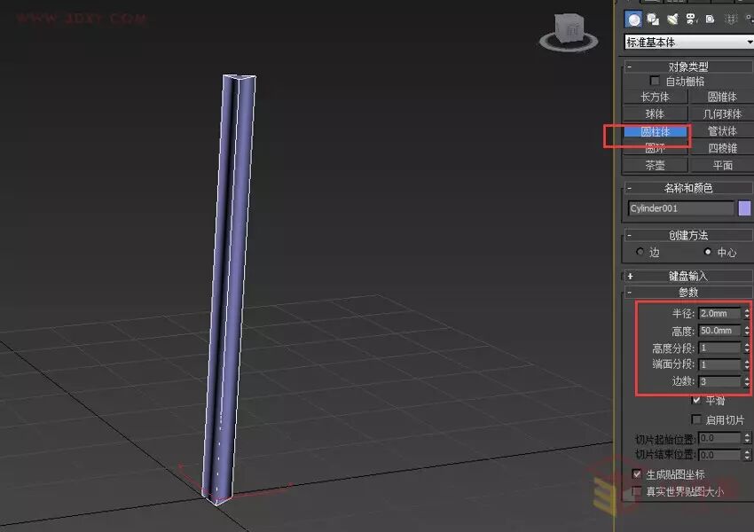 1.创建一个圆柱体,半径:2MM;高度:50MM;分段:1;边数:3