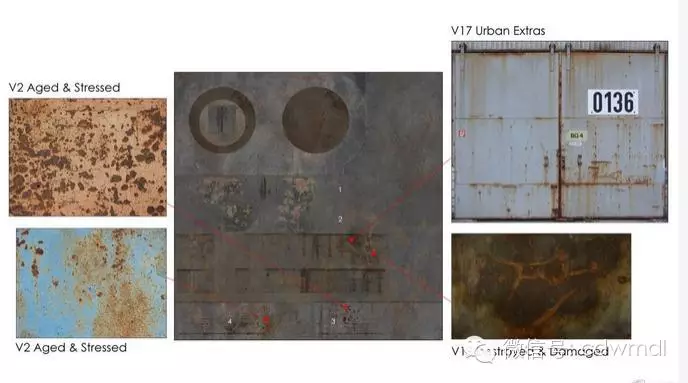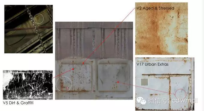 舱口的铁锈和污垢等都是从右上方纹理中提取的,而小孔素材则取自3dtotal网站内total textures: v17 – urban extras dvd.