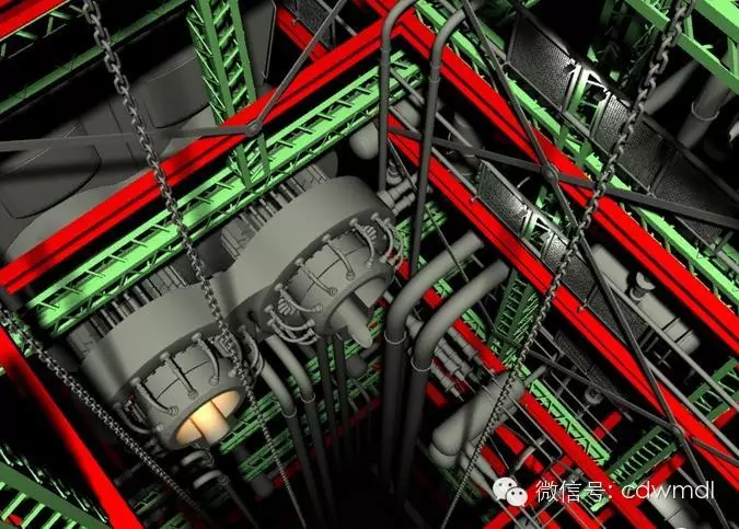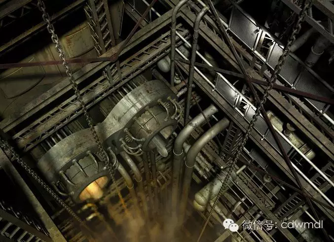 者使用同样的技术,制作场景中大部分几何形体的纹理(除了前面提到的管道和舱口,以及分布在矿井右侧的圆柱形水槽之外)。