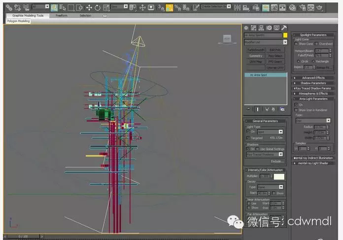下面是一个未赋予材质的场景,仅显示几何体和灯光(图01)。场景中有两个泛光灯,用来表现发热废气发出的光晕和辉光,主光源由一盏区域光来表现。(如图02所示)