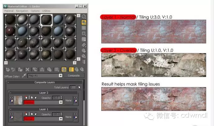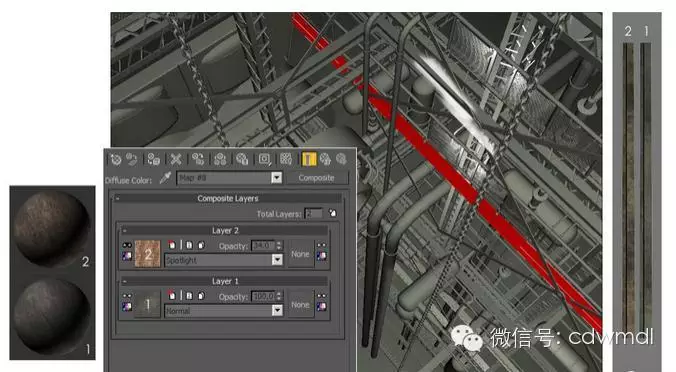在composite map[复合贴图]卷展栏(见material editor[材质编辑器])里将第二层设置为合理的混合模式,从而可以看到两层的叠加效果(本例中采用overlay[叠加模式])。