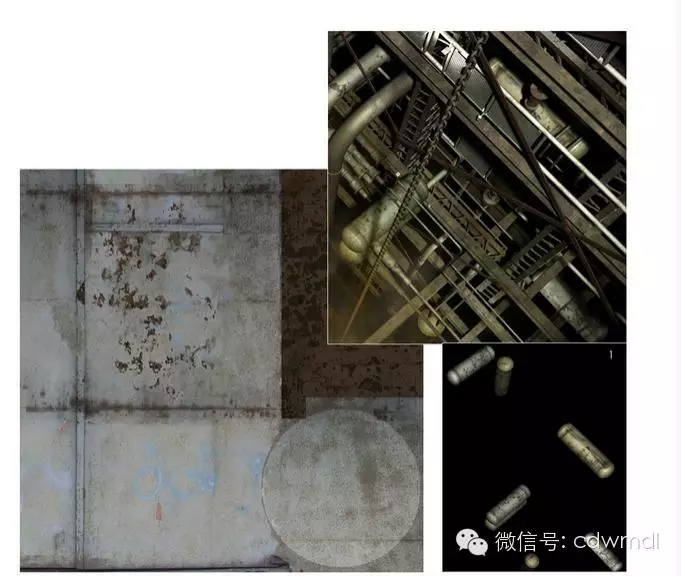 者使用同样的技术,制作场景中大部分几何形体的纹理(除了前面提到的管道和舱口,以及分布在矿井右侧的圆柱形水槽之外)。