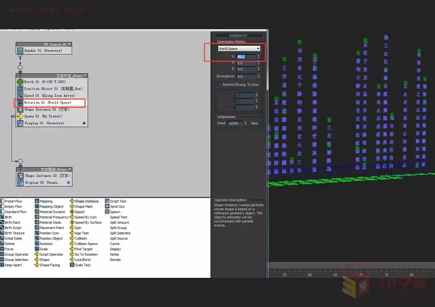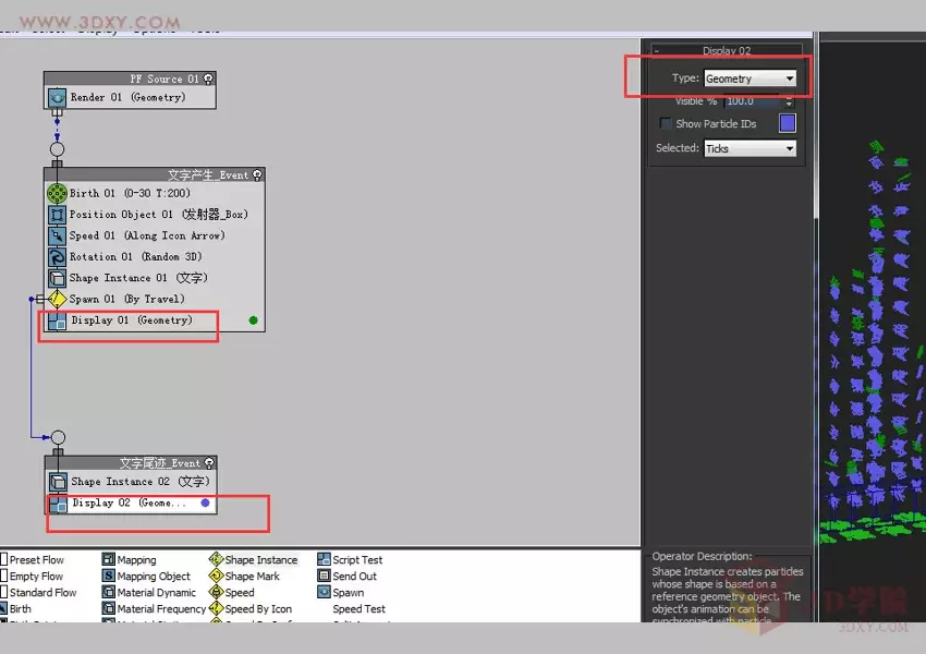 11.拖放一个Shape Instance操作器到粒子视图的空白区域,这样会自动建立一个新事件,将其命名为“文字尾迹_Event“,选择这个Shape Instance操作器,它的设置参数和事件“文字产生_Event”中Shape Instance操作器的设置完全一样。
