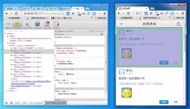 在需要调试的页面加入中以下脚本:,注意把localhost换成手机能够访问的真实IP地址。当手机访问这个页面时,weinre客户端就会检测到目标设备,然后就可以对它进行调试了。