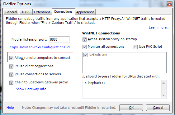 PC上开启fiddler,并在设置中勾选“allow remote computers to connect”
