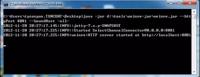 java -jar d:\\tools\\weinre-jar\\weinre.jar –httpPort 8081 –boundHost -all- (httpPort是指定服务端口,boundHost参数说明可以使用IP访问,all参数代表支持所有的host)。