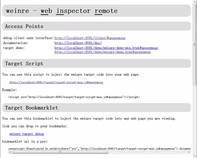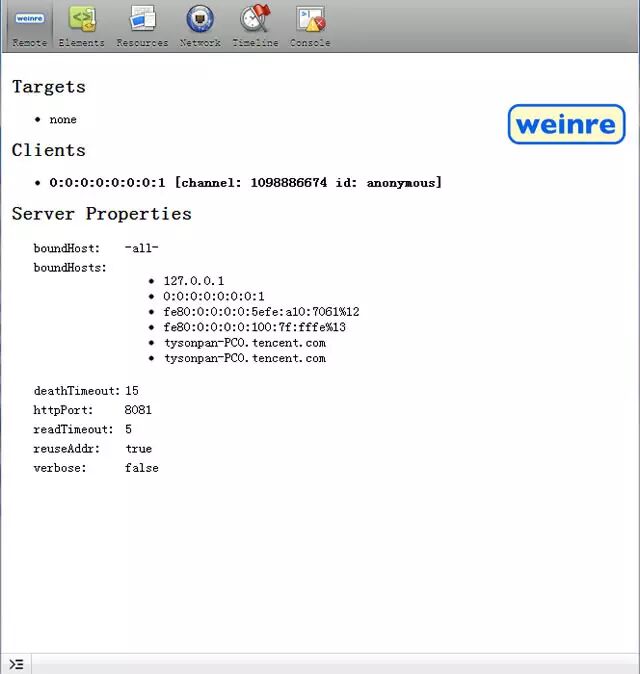 访问localhost:8081,如果看到如下的页面,说明weinre已经启动成功: