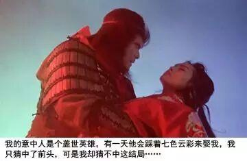 紫霞仙子的现实阶段:“我的意中人是个盖世英雄,有一天他会踩着七色云彩来娶我,我只猜中了前头,可是我却猜不中这结局……”。