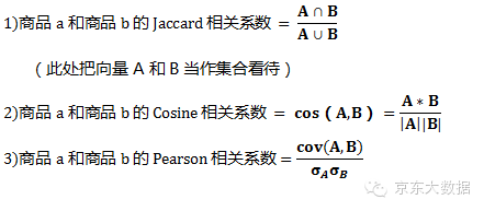 设商品a的特征向量为向量A, 商品b的特征向量为向量B,那么常用的计算相关性的方法有以下: