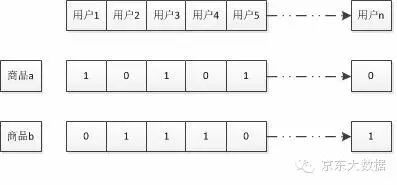 我们经常会用到的比如计算两个商品的相似度,或计算两个用户之间的相似度,如下图所示,是基于商品的购买行为,来计算两个商品之间的相似程度。我们先基于此例来说明。这里每个商品可以表示成用户购买行为的特征向量,其中1表示此用户购买,0表示此用户未购买。
